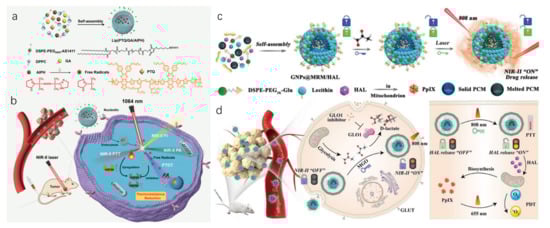 (a) Synthesis of NIR-II light excitation Lip (PTQ/GA/AIPH) nanoparticles for fluorescence imaging/photoacoustic imaging-guided combination therapy. (b) Schematic diagram of NIR-II light excitation FI/PAI imaging-guided photothermal therapy (PTT) and photonic thermodynamic therapy (PTDT) for triple-negative breast cancer in vivo. (c) Synthesis of the GNPs@MRM/HAL nanoparticles and illustration of their “dual lock-and-key” properties. (d) Schematic diagram of GNPs@MRM/HAL nanoparticles in NIR-II fluorescence imaging-guided phototherapy of cancer. Adapted with permission from [73]. Copyright 2021 John Wiley and Sons. Adapted with permission from [74]. Copyright 2022 John Wiley and Sons.