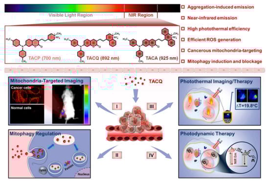 In 2014, Liu and coworkers developed a mitochondria-targeting AIEgen that can induce cell stress and lead to mitochondrial dysfunction for killing cancer cells, and in which the fluorescence of the probe can only be turned on when the rotation around the N-N bond is restricted and the intramolecular hydrogen bonds are formed [98]. Before this work, AIEgens were extensively used for fluorescence imaging, so it offers new possibilities for the development of potential therapeutic agents for diagnosis and therapy. In 2016, Zhang et al. synthesized a series of nanoparticles assembled from pyridinium-substituted tetraphenylethylene salts (PTPE) for targeting mitochondria, and some of them exhibited efficient tumor accumulation and growth inhibition in vivo with negligible systemic toxicity [99]. The assembly of PTPE salts with different alkyl chain lengths and counter anions under different conditions was further explored [100], and the targetability and imaging ability of mitochondria are ascribed to AIE effects, which are promising for cancer therapy. In a recent study, Su et al. developed AIEgens for the treatment of cis-platin-resistant cancer cells for the first time, which can induce ROS production and disrupt the mitochondrial structure, impairing mitochondrial and glycolytic metabolism [101]. Chemotherapeutic agents with AIE properties and anticancer activity offer a promising platform for integrating diagnosis and treatment. Recently, Tang et al. synthesized and developed an AIE-active NIR fluorophore with mitophagy-modulating activity for multimodal cancer theranostics (Figure 5) [102].