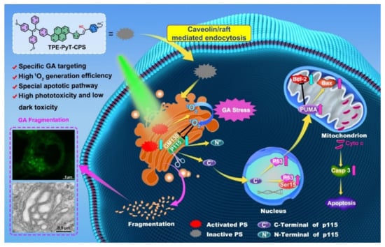 - Liu, M.; Chen, Y.; Guo, Y.; Yuan, H.; Cui, T.; Yao, S.; Jin, S.; Fan, H.; Wang, C.; Xie, R.; et al. Golgi apparatus-targeted aggregation-induced emission luminogens for effective cancer photodynamic therapy. Nat. Commun. 2022, 13, 2179. [Google Scholar] [CrossRef] [PubMed]