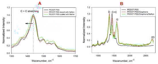 Raman spectra of PEDOT:PSS (A) or PEDOT:PSS/graphene (B) upon addition of Nafion.