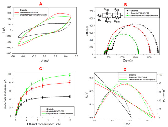Addition of electrochemically exfoliated graphene into the structure of PEDOT:PSS is likely to improve the polymer conductivity by forming a conductive network between graphene flakes [43]. The inter-stacking of graphene layers between PEDOT and PSS helps to delocalize charges in the PEDOT backbone and rapidly transfer electrons to DCPIP, thus reducing the charge-transfer resistance [44]. Improved conductivity can also be attributed to the lesser presence of insulator PSS particles in the conductive composition [45]. Figure 3A shows cyclic voltammograms for bioanodes with different coatings. As can be seen from the data obtained, the highest anode currents were observed for a composition with PEDOT:PSS. The CV of the PEDOT:PSS electrode is of a nearly rectangular form, and only one redox shoulder is present at 0.26 V indicating a low faradic activity and highly capacitive behaviour [46]. Addition of graphene to the conductive layer leads to a decrease in the capacitive component of the system, which should have a positive effect on the performance of this bioanode in the MFC. To assess the conductivity change of bioelectrodes based on various composites, we used electrochemical impedance spectroscopy. Figure 3B shows Nyquist plots and corresponding equivalent circuits for bioanodes with PEDOT:PSS and PEDOT:PSS/graphene. Addition of PEDOT:PSS and graphene was shown to lead to a decrease in the diameter of both semicircles in the diagrams, which corresponds to a decrease in the overall electron transfer resistance at the introduction of highly conductive components to the composite. The Rs value for the three electrodes was 355 ± 33 Ohms. The value of RCT1 at the addition of PEDOT:PSS decreased from 502 ± 21 to 224 ± 11 Ohms, and that of RCT2 at the addition of PEDOT:PSS with graphene decreased from 2042 ± 103 to 1021 ± 55 Ohms. Thus, it can be concluded that the addition of PEDOT:PSS/graphene has a positive effect on the overall conductivity of the bioanode in the MFC. We obtained calibration curves for substrate concentrations for the bioanodes formed (Figure 3C). Ethanol was taken as a substrate as it is utilized by Gluconobacter bacteria the most actively [27]. The sensitivity of the electrode to ethanol was maximal for the graphite/PEDOT:PSS composition to make 16.9 µA·mM−1·cm−1 and the detection range 0.05–10 mM. The Hill coefficient in all three cases was approximately the same and equal to unity, which indicates that the addition of PEDOT:PSS does not lead to a change in the cooperativity of substrate binding by bacterial enzyme systems. The values of the main parameters for all bioanodes are shown in Table 1. The polarization and power density curves recorded for the three MFC prototypes are shown in Figure 3D. It is worth noting that the maximum open circuit voltage (OCV) was observed in the MFC based on the control graphite bioanode; herewith, addition of conductive materials led to its decrease. The figure shows that the maximum power of 81 mW/m2 was obtained for the MFC based on a PEDOT:PSS/graphene-modified bioanode, which is comparable with the power of the PEDOT:PSS-based MFCs described in the literature [47,48].