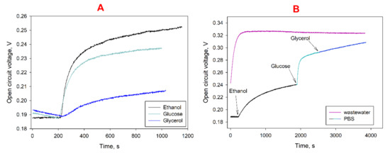 The strain G. oxydans has a wide substrate specificity [49] and is capable of oxidizing sugars, lower and triatomic alcohols and some organic acids [50]. We tested the possibility of generating energy by the developed MFC using three types of compounds as the sole carbon source. Glucose, ethanol and glycerol were picked, as all these compounds may be present in municipal wastewater. A change in the MFC open-circuit voltage at the addition of substrates into the anode compartment is shown in Figure 4A. Immediately upon addition of substrate into the MFC chamber, the OCV sharply increased; in the first seconds after addition, the rate of voltage change was 0.7 mV/s for ethanol, 0.4 mV/s for glucose and 0.06 mV/s for glycerol. After 15 min, the OCV level reached 90% of the generated maximum. The presence of several substrates in the MFC anolyte should lead to an overall increase in the generated MFC voltage. The change in OCV during the sequential addition of the investigated substrates to the MFC anode compartment is shown in Figure 4B. The voltage generated by the MFC increases from 0.25 V when using ethanol as a single substrate to 0.31 V when ethanol, glucose and glycerol are sequentially introduced into the cell at a concentration of 1 mM. The rate of OCV change in the first minutes of MFC operation was 0.5 mV/s, which is comparable to the rate at the addition of a separate substrate. The observed effect is due to the fact that several enzyme systems of microorganisms are simultaneously involved in this case. When the MFC bioanodes were immersed into a sample of wastewater taken at the Pushchino water treatment facilities, there was also a sharp OCV increase in the first minutes of operation. Figure 4B shows that the generated voltage when using wastewater without additional substrates turned out to be higher than for an MFC device based on PBS with three separate substrates added. Thus, it can be concluded that the wastewater sample under study contained easily oxidized organic compounds that can be utilized by G. oxydans immobilized on the MFC bioanode. This indicates that the developed MFC can be used for efficient wastewater treatment and generation of electricity in the process of the treatment.