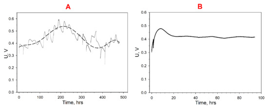 To assess the efficiency of the developed MFCs, the level of generated voltage was measured for several days. Both synthetic wastewater (with a glucose content of 3 mM) and real samples of municipal wastewater were used as an anolyte. When using synthetic wastewater, carbon sources were periodically depleted, so every four days 3 mM of glucose was added to the MFC anode compartments. Moreover, decolorization of mediator solutions in the anode and cathode compartments was observed due to the incomplete reversibility of the oxidation–reduction of these compounds (as seen by the asymmetry of the oxidation–reduction peaks on the CV (Figure 4A)). For this reason, redox mediators were additionally introduced into the MFC chambers every seven days (DCPIP and potassium hexacyanoferrate into the anode and cathode compartments, respectively). The obtained plots of MFC-generated voltage versus time are shown in Figure 5.
