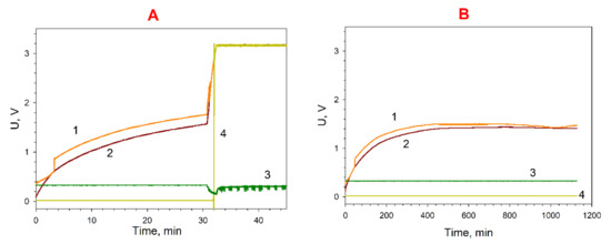 Diagrams of electric energy accumulation by a 6800-µF capacitor from two MFC models during wastewater treatment: 1, charge voltage; 2, voltage across the accumulating capacitance; 3, input voltage coming to the converter; 4, voltage signalling that the set charge level has been reached. (A), the first 24 h; (B), after 96 h.