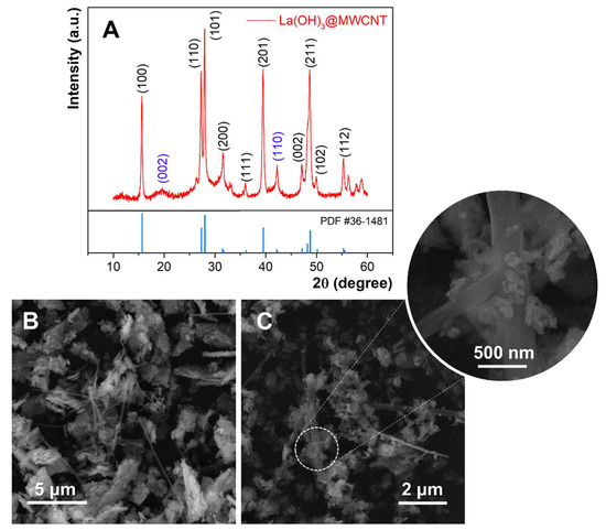 The XRD patterns of synthesized La(OH)3@MWCNT are shown in Figure 1A. It is clear that the sample is highly crystalline and the diffraction peaks at 15.6°, 26.3°, 27.9°, 31.5°, 36.0°, 39.5°, 47.1°, 48.7°, 49.9°, and 55.3° match well with the crystal planes of (100), (110), (101), (200), (111), (201), (002), (211), (102), (112). All of the reflections can be assigned to lanthanum hydroxide having a hexagonal symmetry and P63/m space group (JCPDS #36-148128) [52]. The average crystallite size of La(OH)3 nanoparticles is (26 ± 4) nm, calculated by Scherrer’s equation. The peaks from other phases occurring at 19.6° and 42.3° can be assigned to (002) and (110) reflections of graphitic MWCNT [53]. This can be proof of successful composite formation.