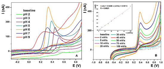 (A) Optimization of pH of the 0.1 M PB supporting electrolyte from pH 2 to pH 9. (B) CV in 0.1 M PB pH 6 in the potential range from −0.5 V to 1 V at the scan rates from 2 mV/s to 100 mV/s. (inset B) Linear plot of oxidation peak current vs. scan rate.