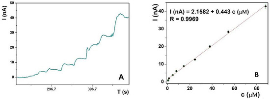 Amperometric determination was used for UA quantification due to its low detection limit, rapidness, wide linear range, easy signal processing, and the possibility of following the real-time concentration changes in flow systems. The amperometric response of the La(OH)3@MWCNTs/CP electrode, containing 10% of nanomaterial mixed in the CP, toward different standard solutions of the UA, was recorded in 0.1 M PB pH 6, at the fixed potential at 0.3 V (Figure 3A). Successive UA addition to the solution was accompanied by a corresponding current increase and the calibration plot I (nA) against c (µM) was constructed (Figure 3B). The linear response was in the range from 0.67 μM to 121 μM UA with the detection limit, calculated from the plot as 3 S/m (where S is the standard deviation of the blanc and m is the slope of the calibration plot), 64.28 nM, and the analogously calculated limit of quantification (10 S/m) was 0.22 μM. The calibration curve follows the trend expressed by the linear regression equation I (nA) = 2,1582 + 0.4430 c (μM), with the linear regression coefficient R = 0.9969.