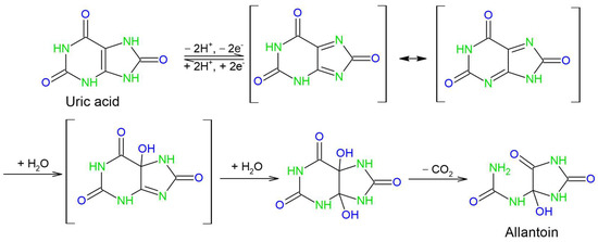 Both high and low human plasma UA concentrations can indicate a pathological state. On the one hand, UA acts as a scavenger of peroxyl radicals, hydroxyl radicals, and singlet oxygen, thus exhibiting antioxidative features. It is a specific inhibitor of radicals generated by the decomposition of peroxynitrite, preventing cell injuries and nitration of tyrosine residues in proteins. Furthermore, it can protect against oxidative damage by chelating metal ions such as iron and copper, lowering their catalytic activity in free-radical reactions [4]. UA also shows neuroprotective properties and reduces the risk of multiple sclerosis, Parkinson’s disease, Alzheimer’s disease, and optic neuritis [5].