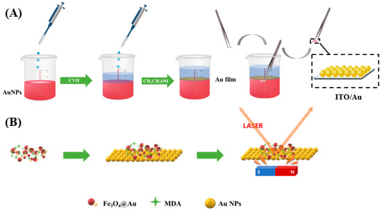 Figure 1. Schematic diagram of (A) self-assembly preparation of ITO/Au and (B) improvement of SERS detection sensitivity for MDA by magnetically inducing a sandwich structure.