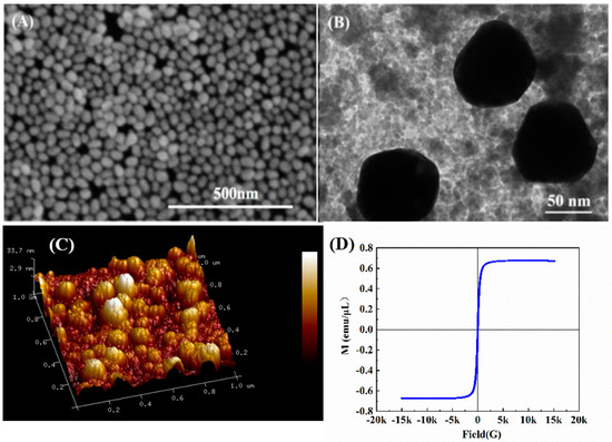 Figure 2. (A) SEM image of ITO/Au. (B) TEM image of Fe3O4@Au. (C) Three−dimensional AFM image of ITO/Au. (D) Hysteresis loop of Fe3O4@Au.