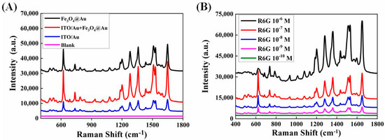 Figure 5. (A) Raman spectra of 10−6 mol/L R6G on optimal ITO/Au, Fe3O4@Au, and sandwich structure of ITO/Au and Fe3O4@Au. (B) Raman spectra of different concentrations of R6G on ITO/Au by using magnetically inducing strategy.