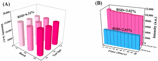 For checking preparation reproducibility, the SERS intensities at 622 cm−1 of 10−6 mol/L R6G solution were recorded from three random points on one ITO/Au of three different batches. As shown in Figure 7A, it shows promising fabrication reproducibility with an RSD of 6.32%.