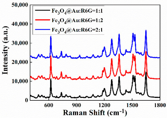 The different mixtures (volume ratios of 1:1, 1:2, and 2:1) of Fe3O4@Au and R6G (10−6 mol/L) were explored for reaching an optimal SERS sensing condition. As shown in Figure 8, the strongest Raman signal was obtained for the 1:2 volume ratio.