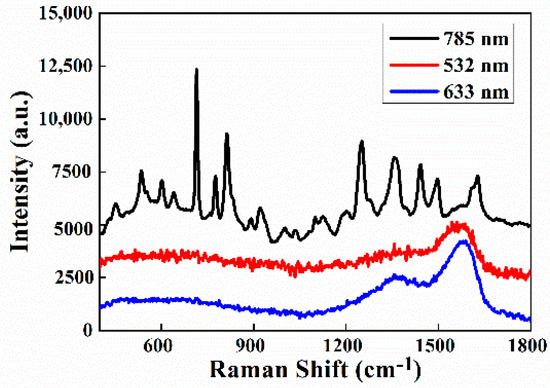 It is well known that SERS intensities also depend on the excitation laser wavelength. Herein, three lasers with different wavelengths, 532, 633, and 785 nm, were used to record the SERS signals of MDA (100 μg/mL). As shown in Figure 9, when using 532 and 633 nm lasers, the characteristic Raman peaks of MDA could barely be observed due to visible laser thermal carbonization of the surface species. By contrast, excitation laser at 785 nm is a suitable option for the SERS experiment.