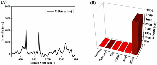 Figure 11. (A) Sandwich-structure-based SERS spectrum of MDA (1 μg/mL) in urine. (B) Intensities of the SERS band at 714 cm−1 for MDA and other interference species in urine samples.