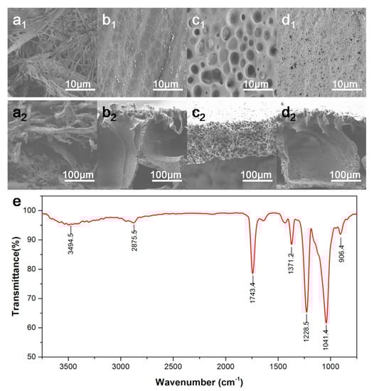 SEM images of the surface (a1,b1,c1,d1) and cross-section (a2,b2,c2,d2) of (a) a paper strip purchased from Whatman (England) with a bore diameter of 11 μm, (b) CA membranes, (c) CA@LiCl membranes, and (d) CA@PEG-2000 membranes. (e) FTIR spectra of CA@PEG-2000 membranes.