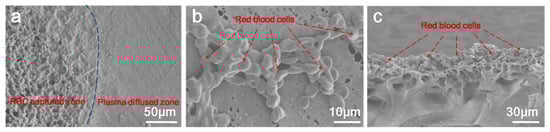 SEM images of the (a,b) surface and (c) cross-section of CA@PEG-2000 membranes after blood cell separation. The dotted blue line represents the dividing line between blood cells and plasma.