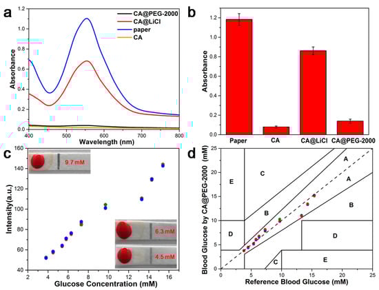 (a) UV-Vis absorption spectra of the chromogenic reaction with the different membranes. (b) Test repeatability of different membranes at 567 nm (standard deviation, n = 5). (c) The chromogenic intensity (figures with physical pictures). (d) Error grid analysis of real human blood samples in CA@PEG-2000 membranes.