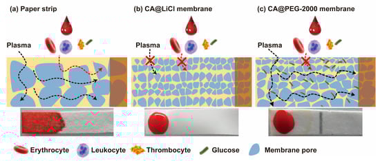 The morphologies of the surface and cross-section of CA@PEG-2000 membranes after blood separation were studied by SEM, and are in Figure 2. The blood cells were trapped on the surfaces of CA@PEG-2000 membranes due to the size sieving effect of micropores on the membrane surface. In the magnified SEM images (Figure 2b), the red blood cells retained their original morphology and did not rupture at separation. As shown in Figure 2c, the red blood cells were trapped on the upper surface and did not enter the interior of the porous membrane, indicating that the micropores on the surface acted as the separation layer. Furthermore, the interior part had larger pores that allowed for the diffusion of analytes such as glucose via micro-capillary and liquid diffusion. According to the microscope images in Figure 3, the plasma diffused through the porous membrane by capillary force, and the liquid filled the pores, causing a change in light transmission.