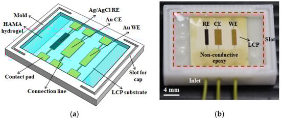 As illustrated in Figure 1a, the electrochemical devices were fabricated via standard microfabrication techniques [33]. Initially, a liquid crystal polymer (LCP) sheet (ULTRALAM 3850, 100 µm) with copper cladding (18 µm) purchased from Rogers Corporation, USA, was cut into a 4-inch wafer size and used as a substrate for the devices. The cladding layer was removed by dipping the sheet in the copper etchant for 45 min, during which agitation was provided in order to facilitate the etching process. The sheet was then ultrasonically cleaned with acetone and deionized water to remove both organic and inorganic impurities. After drying with nitrogen gas, the sheet was thermally attached to a 4-inch silicon wafer using a photoresist (AZ 9260, 10 µm) as an adhesion layer. Thereafter, another layer of the photoresist (5 µm) was spin-coated on top of the LCP sheet and baked on a hotplate at 110 °C for 4 min. Upon the exposure of the photoresist under ultraviolet (UV, 365 nm, i-line) light followed by developing in the photoresist developer solution (AZ 400K), the patterns of the electrodes, connection lines, and contact pads were formed. After photolithography, a layer of chromium/gold (Cr/Au, 50/300 nm) was deposited using a magnetron sputtering system, in which the Cr layer was used to improve adhesion between the Au layer and the substrate. The remaining photoresist together with the deposited material was completely removed through the lift-off process by dipping the wafer in acetone solution for 12 h. This Au layer served as both the working and counter electrodes for the electrochemical devices. By repeating the photolithography-deposition procedure with a different photomask, the reference electrodes of the electrochemical devices were constructed by a combined layer of silver/silver chloride (Ag/AgCl, 150/250 nm).