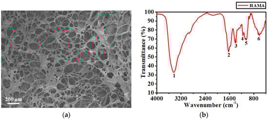 (a) Cross-sectional SEM image and (b) FTIR spectrum of the synthesized HAMA hydrogel. The numbers in (b) denote the prominent peaks detected by the FTIR analysis.