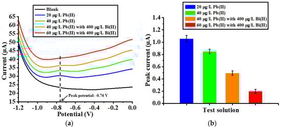 To evaluate the adsorption performance of the HAMA hydrogel-modified electrochemical devices, a series of SWASV experiments were carried out. The magnitude of each stripping peak obtained in the SWASV experiments was measured with respect to its baseline. Initially, the response was recorded in a solution with 20 µg/L Pb(II) (blue line in Figure 4a), in which a clear stripping peak was observed close to a potential −0.76 V, with an average peak magnitude of 1.059 µA (refer to Figure 4b). When the Pb(II) concentration was increased to 40 µg/L, the device exhibited a smaller stripping peak (green line in Figure 4a) with a decreased average peak magnitude of 0.848 µA. To investigate whether such a decrease in the stripping peak was caused by the reduced alloying capability of the working electrode, 400 µg/L Bi(II) was added to the test solution. According to the literature [38,39,40], Bi is capable of forming low-melting-temperature alloys with heavy metals, which significantly facilitates the accumulation of metal ions by the working electrode in the course of the deposition. As shown by the orange line in Figure 4a, adding Bi(II) did not improve the accumulation of Pb(II) ions for the device, which was manifested by an even smaller stripping peak with a further decreased average peak magnitude of 0.496 µA. With 400 µg/L Bi(II) in the test solution, a subsequent increase in the Pb(II) concentration to 60 µg/L (red line in Figure 4a) resulted in an indistinguishable stripping peak with a tiny average peak magnitude of 0.199 µA. The experimental results imply that the developed HAMA hydrogel-modified electrochemical device is capable of adsorbing the Pb(II) ions that are available in the solution.