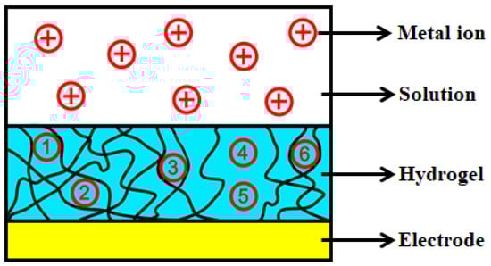 To explain the observed phenomena, a hypothesis pertaining to the adsorption mechanism of the HAMA hydrogel-modified electrochemical devices is proposed. A schematic model illustrating the mechanism is depicted in Figure 5, in which red circles (with a plus sign or number) represent the dissolved heavy metal ions in the solution. The network denoted by black solid lines above the electrode layer represents the microscopic porous structure of the HAMA hydrogel. First, free-moving metal ions in the solution migrated to the vicinity of the hydrogel under the effect of diffusion due to a high concentration gradient established between the solution and the hydrogel. Thereafter, the metal ions penetrated the hydrogel and interacted with the functional groups of the hydrogel’s polymer chain. Some of the metal ions (e.g., No. 1, 2, 3, and 6 in Figure 5) were directly captured by the polymer chain due to the molecular interaction.