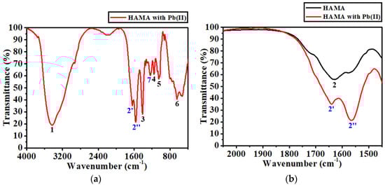 (a) FTIR spectrum of the HAMA hydrogel soaked in a solution of 100 µg/L Pb(II), in which the numbers 2′, 2″, 7 (in blue) denote the new peaks. (b) Comparison of FTIR spectra in a frequency band from 2050 to 1450 cm−1 between the pure HAMA hydrogel and the one soaked in Pb(II) solution.