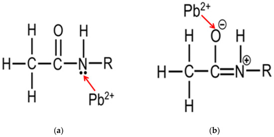 Despite the contribution from nitrogen, as well as carbonyl oxygen, in the process of the complex formation, the tendency to form a Pb(II)-O ligand seems much higher than that of a Pb(II)-N ligand if one compares the negative shift with the positive one. The negative shift (~62 cm−1) is 5 times larger than the positive shift (~12 cm−1), suggesting that the carbonyl oxygen of the amide group could play the dominant role in the construction of the Pb(II)–amide complex. This could be explained by the fact that the type II configuration of an amide group is more stable than the type I configuration [41]. Owing to the delocalization, the electron density distributed on the carbonyl oxygen is much greater than that on the nitrogen, making the carbonyl oxygen behave as though it is being completely negatively charged, thereby attracting more Pb(II) ions.