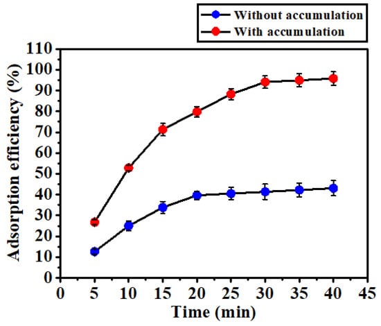 The effect of electrochemical accumulation pertaining to the proposed adsorption mechanism was investigated by quantifying the amount of Pb(II) ions adsorbed by the modified device. Originally, the Pb(II) concentration of each test solution was 100 µg/L. The concentration was subsequently measured by the ICP-MS instrument after every 5 min of adsorption. The results obtained are presented in Figure 8. When the electrochemical accumulation was not activated, i.e., only the HAMA hydrogel was responsible for the adsorption of Pb(II) ions (blue dots in Figure 8), the adsorption rate slowly increased within the first 20 min. Thereafter, there was no significant increase in the adsorption rate. The adsorption behavior of the HAMA hydrogel could be attributed to the diffusion effect. Initially, metal ions moved into the vicinity of the hydrogel driven by the high-ion-concentration gradient established between the solution and the hydrogel. This corresponded to the increase in the adsorption rate observed at 5, 10, 15, and 20 min. Thereafter, the concentration gradient was significantly reduced, which could have resulted in a rapid saturation of adsorption for the HAMA hydrogel, corresponding to the data points observed at 25, 30, 35, and 40 min. It was calculated that only 43.05% of Pb(II) ions were adsorbed by the device if electrochemical accumulation was not triggered.