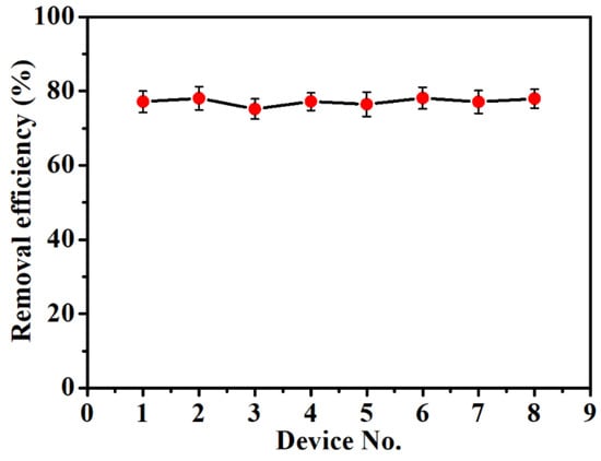 To explore the practical application of the HAMA hydrogel-modified electrochemical device, adsorption experiments were performed in a solution of tap water with 400 µg/L Pb(II). Each device was immersed in the test solution for 20 min, during which the electrochemical accumulation was activated. As shown in Figure 9, all the devices exhibited comparable Pb(II) removal capabilities with an average removal efficiency of 77.2%. The relative standard deviation (RSD) among the eight devices was calculated to be as low as 1.28%, demonstrating good repeatability and reproducibility of the devices. These experimental results reveal that the HAMA hydrogel-functionalized electrochemical device has great potential for deployment at a variety of locations for in situ removal of Pb(II) ions. It is worth mentioning that the water quality conditions (such as pH value, quantity of suspended particulates, other heavy metal ions, etc.) at the locations of interest could affect the adsorption performance of the HAMA hydrogel-modified electrochemical device. Therefore, it is recommended to conduct some preliminary experiments in some specific areas before the large-scale deployment of the devices.