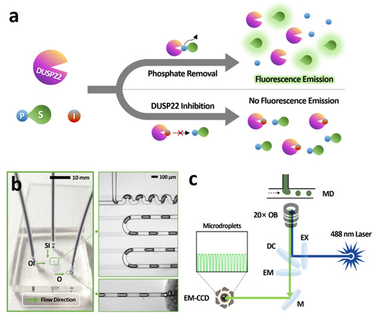 (a) Schematic representation of the working principle of phosphatase activity and inhibition assays (S, substrate; I, inhibitor; P, phosphate). (b) A droplet-based microfluidic chip with a simple T-junction structure was used for the analysis of DUSP22 activity. SI, sample inlet; OI, oil inlet; and O, outlet; Arrowhead, flow direction of liquid. (c) Optical setup for analyzing the fluorescence signal from microdroplets in a microfluidic channel (MD, microfluidic device; OB, objective; EX, excitation filter; DC, dichroic mirror; EM, emission filter; M, mirror; EM-CCD, electron multiplying-charge coupled device).