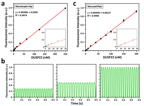 To demonstrate the dPAA, various concentrations of DUSP22 (0 to 250 nM) were added to a fixed concentration of 3-OMFP substrate (10 µM). After 20 min incubation at room temperature, the samples were injected onto a microfluidic chip, and droplets were generated in a steady state. To generate monodisperse droplets at the T-junction (Figure 2b), both the sample and the oil were injected at a constant flow rate of 1.0 μL/min using a precision syringe pump. Fluorescence intensity emitted from the droplets was measured using an EM-CCD. The results showed that the fluorescence intensity increased with increasing concentration of DUSP22, suggesting that the droplet-based detection system can detect and quantify activity of phosphatases (Figure 3a). It showed excellent linearity at different concentrations of DUSP22. The linear equation for linearity was y = 0.00388x + 0.0208 and the R2 value was 0.9974. The dynamic linear range was between 1.95 nM and 250 nM of DUSP22, and the limit of detection (LOD) for DUSP22 was 1.95 nM. Figure 3b shows examples of the fluorescence peaks scanned for 0.5 s from droplets at different DUSP22 concentrations. The standard deviation of the results obtained using dPAA was negligible, so the data points in the graph showed almost no error bars. Taken together, these results indicate that the droplets formed at same time intervals and resulted in uniform fluorescence intensity.