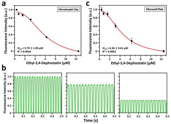 The enzyme inhibition assay is essential in high-throughput drug screening since several samples must be screened. Droplet-based microfluidic system can be used as a platform to perform enzyme inhibition assays due to their advantages of rapid mixing of reagents and low reagent/sample consumption [24,25]. Here, dPIA was demonstrated through a simple dose–response assay using ethyl-3,4-dephostatin as the phosphatase inhibitor (Figure 4a). The fluorescence peaks of representative droplets at different phosphatase inhibitor concentrations are shown in Figure 4b. The dPIA results confirmed that fluorescence intensity values decreased with increasing concentration of ethyl-3,4-dephostatin. This is because ethyl-3,4-dephostatin inhibits DUSP22 and thereby prevents the dephosphorylation of the 3-OMFP substrate. In addition, using the information from each inhibitor concentration, Equation (2) was used to determine the half-maximal inhibitory concentration (IC50) of that inhibitor, which was obtained as 5.79 ± 1.09 μM.