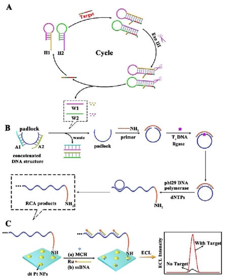 As they are a type of enzyme, polymerases can catalyze DNA and RNA synthesis. They can replicate DNA and form long, linear, tandem, or repetitive chains of DNA with the assistance of a polymerase enzyme from the DNA template, primers, and deoxy-ribonucleoside triphosphate (dNTP) [44]. Polymerase chain reaction (PCR) remains the traditional and the “gold standard” enzyme-assisted DNA amplification strategy in bioanalysis due to its high sensitivity and low cost [45]. However, it has significant disadvantages, including the requirement of sophisticated and complicated processes and the presence of false-positive signals, which limit its practical use in the ECL domain. As alternative polymerase-based amplification techniques, rolling circle amplification (RCA) and hyperbranched RCA (HRCA) have attracted more attention, as they not only inherit isothermal amplification, but also promote improving the amplification efficiency. RCA requires a circular probe and DNA or RNA primers. In the presence of polymerases, prolonged extended ssDNA or double-stranded DNA is synthesized from the primer and the circular probe, and the ECL signal is enhanced based on the RCA product that it is loaded with or based on the in situ form abundant in the ECL luminophores. For example, as shown in Figure 1, two hairpin DNAs (H1 and H2) hybridize with the target DNA, releasing two output DNAs (W1 and W2) with the aid of exonuclease III. Subsequently, the concatenated DNA structure can be opened and can unlock the padlock oligonucleotide probe after being hybridized with two output DNAs. Under the action of the T4 DNA ligase, padlock DNA and other DNA primers are ligated to initiate the RCA reaction. Afterward, a prolong-extended ssDNA complementary to ruthenium (Ru)-labeled ssDNA is produced. Therefore, massive ruthenium (Ru)-labeled ssDNA is captured by the RCA products to generate a remarkable ECL signal, resulting in a large increase in amplification efficiency. The biosensor shows the highly specific and ultrasensitive detection of human immunodeficiency virus (HIV) DNA fragments when the detection limit is down to 27.0 aM [30]. Yen et al. utilized the RCA strategy to produce massive, long ssDNAs with a pH-dependent i-motif forming sequence, which was able to bind with hemin and catalyze the ECL reaction with the assistance of luminol/H2O2 solution. Because the i-motif structure is sensitive to pH change, a novel solid-state sensor for pH detection with a wide dynamic range from pH 4.0 to 7.4 was proposed [46]. To further improve the reaction efficiency, He et al. fabricated a high-reproducibility-and-sensitivity ECL biosensor for human papillomavirus 16 E6 and E7 by employing bovine serum albumin as a carrier platform to improve local steric hindrance and the HRCA strategy. After the addition of the target HPV DNA, HRCA occurred. Abundant HRCA products with double-stranded DNA (dsDNA) fragments of different lengths were generated, providing enough double helix space for the insertion of dichlorotris (1,10-phenanthroline) ruthenium(II) hydrate [Ru(phen)3]2+, which was acting as an ECL indicator, and releasing a strong and easily detected ECL signal [31]. Most RCA or HRCA-based ECL biosensors have shown great potential to avoid false-positive signals while also improving the sensitivity.