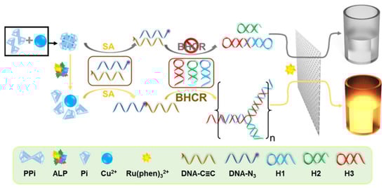 Example of the ECL biosensor for ALP detection based on BHCR amplification. Reproduced with permission from [60]. Copyright 2021, American Chemical Society.