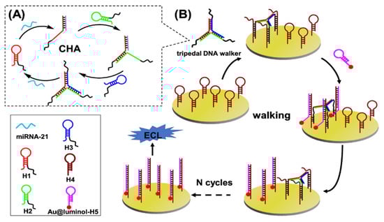 Example of the ECL biosensor for miRNA-21 detection based on the DNA walker strategy: (A) generation process of the tripedal DNA walker; (B) walking cycles of the DNA walker. Reproduced with permission from [22]. Copyright 2020, American Chemical Society.