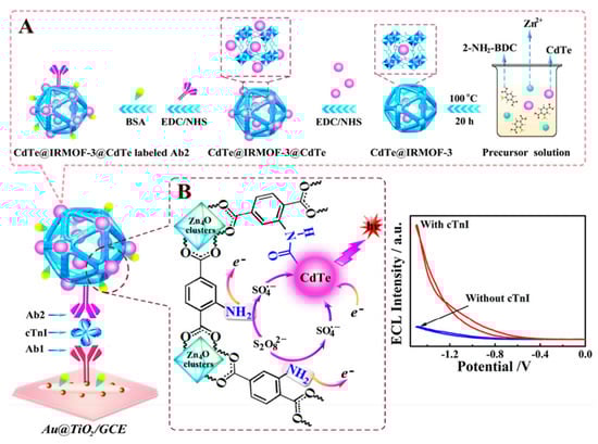 (A) Preparation of the signal probe. (B) Possible mechanism of IRMOF−3 accelerator-mediated enhancement of cTnI detection in the CdTe/S2O82− system. Reproduced with permission from [70]. Copyright 2018, American Chemical Society.