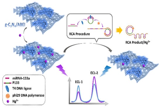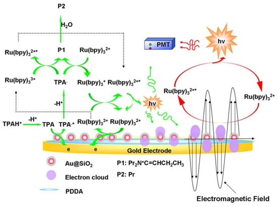Electrogenerated chemiluminescence (ECL) is the phenomenon resulting from electrogenerated species undergoing an electron-transfer reaction at the electrode surface, resulting in the emission of light [1,2,3]. ECL has received a large amount of attention due to its advantages of high sensitivity, low background noise, spatial and temporal control, and no required light source [4,5,6,7]. The first detailed ECL studies were reported in the 1960s by Hercules and Bard [8,9]. Since then, ECL has gradually become a major area of research, with studies encompassing fundamental studies, reagent development, and analytical applications. Many reviews on the details and on our comprehensive understanding of ECL have been published [10,11,12,13]. So far, ECL has been widely applied in various fields, including in food safety, environmental monitoring, and medical diagnosis.