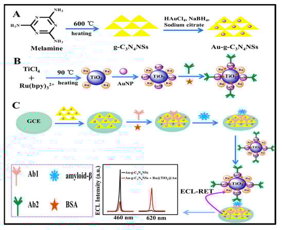 (A) Preparation of Au-g-C3N4NSs; (B) fabrication of Ru@TiO2@Au-Ab2 conjugate; and (C) assembly process of DWR-ECL immunosensor. Reproduced with permission from [88]. Copyright 2021, American Chemical Society.