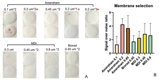 Following assay protocol-I (see Methods), seven types of NCMs were evaluated by comparing the signal-to-noise ratio (SNR) when assaying 10-fold diluted serum spiked with the analyte (100 pg/mL) or non-spiked (0 pg/mL). In this test, triplicates of each type of membrane were evaluated. Figure 3A shows the quantification of SNR using seven types of NCM, while Figure 3B summarizes the SNRs using the different types of NCM. The Amersham membrane, with a pore size of 0.2 µm, was selected as the optimal NCM based on its higher SNR and better morphology of spots. After selecting the make of the NCM for this assay, the number of layers of Amersham 0.2 µm to be used in the vertical flow stack was evaluated. As mentioned above, one, two, and three layers of Amersham 0.2 µm were assembled with one layer of CF7 and two layers of CF5 individually. The NCMs were spotted with capture antibody and tested using spiked and non-spiked serum in triplicates. Our studies show that the two-layer formulation is optimal for rIL-6 detection (please refer to NCMs with a red asterisk in Figure 3A).