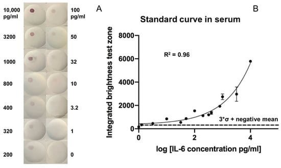 Dose-response curve for detecting rIL-6 spiked into healthy human serum using the vertical-flow paper-based assay. (A) The membrane-type used is Amersham 0.2 µm with two layers. Two replicates were obtained at each concentration. The top left of the membrane represents the test zone. (B) Colorimetric intensity values were calculated using ImageJ. The 3 × σ + negative mean line indicates the summation of the mean intensity of non-spiked healthy serum samples (0 pg/mL) and 3X its standard deviation (σ). The concentration above this line marks the LoD, which is 3.2 pg/mL. The dose-response curve demonstrated a reportable range from 3.2 pg/mL to 10,000 pg/mL of rIL-6 in ten-fold diluted serum.