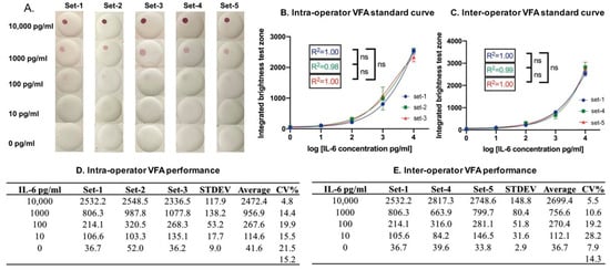 The reproducibility of the Il-6 VFA. (A) Images of rIL-6 serial dilutions obtained using the IL-6 VFA, with assays performed by three researchers. IL-6 VFA sets 1, 2, and 3 were performed by the same researcher so that the intra-operator CV for the standard curves can be computed. IL-6 VFA sets 1, 4, and 5 were performed by three different researchers, one per set, to determine the inter-operator CV. The membrane-type used in (A) is Amersham 0.2 µm with two layers. (B,C) Shown are the corresponding dose-response curves for computing intra-operator reproducibility and inter-operator reproducibility. (D,E) The tables associated with each curve show the inter-operator and intra-operator CV at each point concentration and the average overall CV for the IL-6 VFA assay. The numbers listed within the tables represent the respective imaging score values. The relatively low inter- and intra-operator CV values indicate that the assay results are reproducible across multiple researchers and when repeatedly performed by a single researcher.