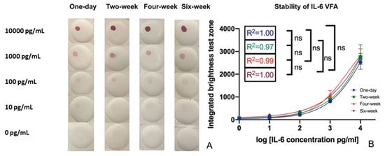 To examine the impact of room temperature storage stability on VFA performance, VFA assay kits generated as described above were stored in desiccator bags at room temperature, marked as one-day, two-week, four-week, and six-week, referring to the duration they were kept at room temperature. A serial dilution of rIL-6 was tested on the stored VFA test kits, stored for varying lengths of time as indicated. The pictures in Figure 6A and the quantification data in Figure 6B demonstrate the impact of storage at room temperature. All four linear regression plots showed the same LoD (10 pg/mL) and similar linearity, indicating that the IL-6 VFA assay maintains its performance characteristics for at least six weeks at room temperature.