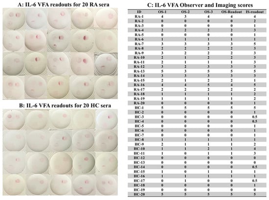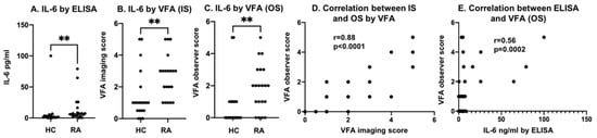 The same serum samples from 20 RA patients and 20 HC subjects tested using the IL-6 VFA were also evaluated using a commercial ELISA for IL-6. The IL-6 levels in RA patients showed a significantly higher value than HC (** p < 0.01, Figure 9A), as did the imaging scores (IS) and observer scores (OS) for the IL-6 VFA (** p < 0.01, Figure 9B,C). As shown in Figure 9D, a strong correlation between the IS and OS IL-6 scores was observed (a Pearson correlation of 0.88). The correlation between the IL-6 levels assayed by ELISA and VFA was modest (a Spearman correlation of 0.56), as displayed in Figure 9E.