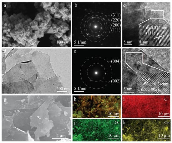 SEM image (a), SEAD (b) and HRTEM (c) of CeO2, TEM (d), SEAD (e) and HRTEM (f) of eGr, SEM image (g) and corresponding elemental mapping of the selected area (h), C (i), O (j) and Ce (k) of CeO2/eGr.