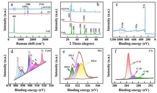 (a) Raman spectra, (b) XRD patterns of eGr, CeO2, and CeO2/eGr, (c) XPS survey spectrum, (d) Ce3d, (e) O1s and (f) C1s spectra of CeO2/eGr composite, respectively.