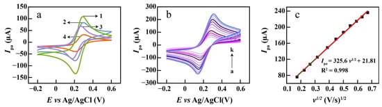 The electroactive surface area is a critical factor for the electrochemical sensor, which was estimated in [Fe(CN)6]3−/4− solution with scan rates ranging from 0.03 to 0.45 V s−1 via the Randles-Sevcik equation (Equation (2)) [].
