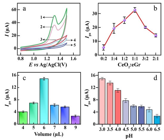 (a) CVs of CeO2/eGr/GCE (1), eGr/GCE (2), bare GCE (3) and CeO2/GCE (4) in 0.1 M PBS solution containing 50 µmol L−1 4-BPA at the scan rate of 100 mV s−1, CeO2/eGr/GCE (5) in PBS solution without 4-BPA; (b) Influence of the ratio between CeO2 and eGr on the response of 4-BPA based on LSVs. (c) the response of 10 µmol L−1 4-BPA to different volumes of composite nanomaterial in PBS solution (pH = 3). (d) Influence of pH on the peak current of 4-BPA in 0.1 M PBS solution.