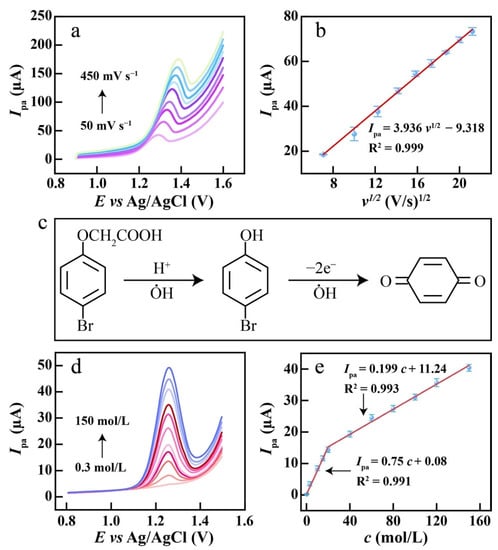 (a) LSVs of CeO2/eGr/GCE in 0.1 M PBS solution containing 20 µmol L−1 4-BPA at 50, 100, 150, 200, 250, 300, 350, 400, 450 mV s−1, (b) the plot of Ipa vs. v1/2, (c) the proposed electrochemical reaction process of 4-BPA, (d) DPVs of CeO2/eGr/GCE in 0.1 M PBS solution containing 0.3, 3, 10, 15, 20, 40, 60, 80, 100, 120, 150 µmol L−1 4-BPA, (e) the plot of the oxidation peak current vs. the concentration of 4-BPA.